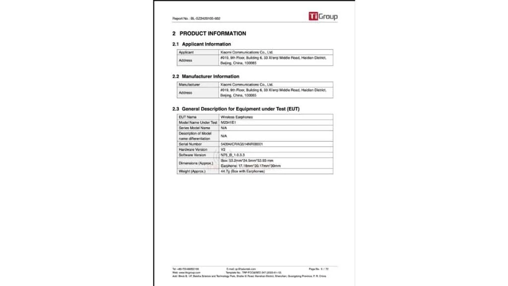 The FCC listing contains some information about the Xiaomi Buds 5, which shows that they will operate in the frequency range of 2400 MHz to 2483.5 MHz and are equipped with a PIFA antenna with an impedance of 50 ohms. According to the listing, the earbuds measure 17.18 mm x 20.17 mm x 30 mm, and the case measures 53.2 mm x 24.5 mm x 53.93 mm, with a total weight of 44.7 grams for the earbuds and case.